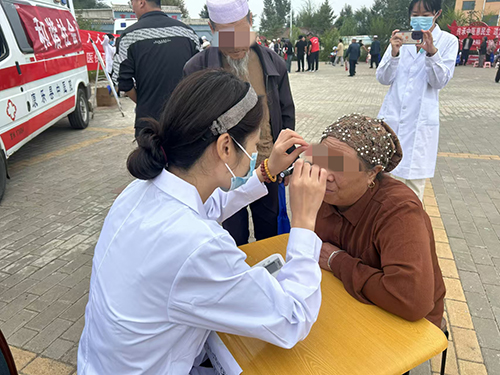 徐东艳医师在对口援助的甘肃临夏康乐县人民医院参加了“共铸中国心·脑心同治走基层”义诊公益活动,随医疗团队来到高林湾村委会为当地群众进行眼科义诊,让村民在家门口就能享受到高水平、高质量的眼科医疗服务。