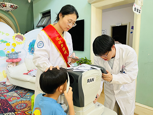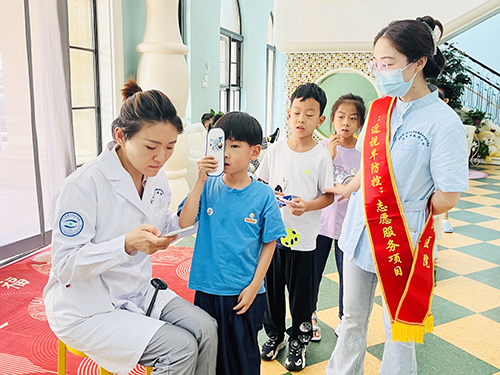 讲座结束后,市二院“近视早防控”志愿服务队的志愿者们运用专业的仪器为孩子们进行视力、验光等专业项目筛查,筛查过程中,通过扫描孩子手中的专属二维码,将筛查数据实时上传到查体系统,实现学生近视筛查数据同步录入、建档、收集、汇总、监管、分析等多种功能,使筛查学生的视力健康状况做到有依据、可追溯。