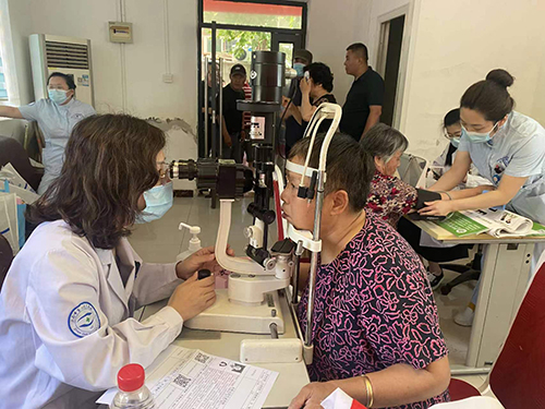 青光眼科副主任、眼科主任医师张苗苗用裂隙灯为社区居民检查眼睛