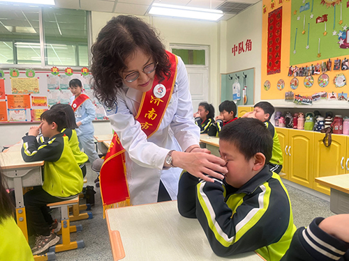 “护瞳行动”志愿服务队走进济南市育晖小学开展了一场别开生面的近视防控培训,为刚刚开学的全校学生普及眼健康知识,并进行眼保健操指导。