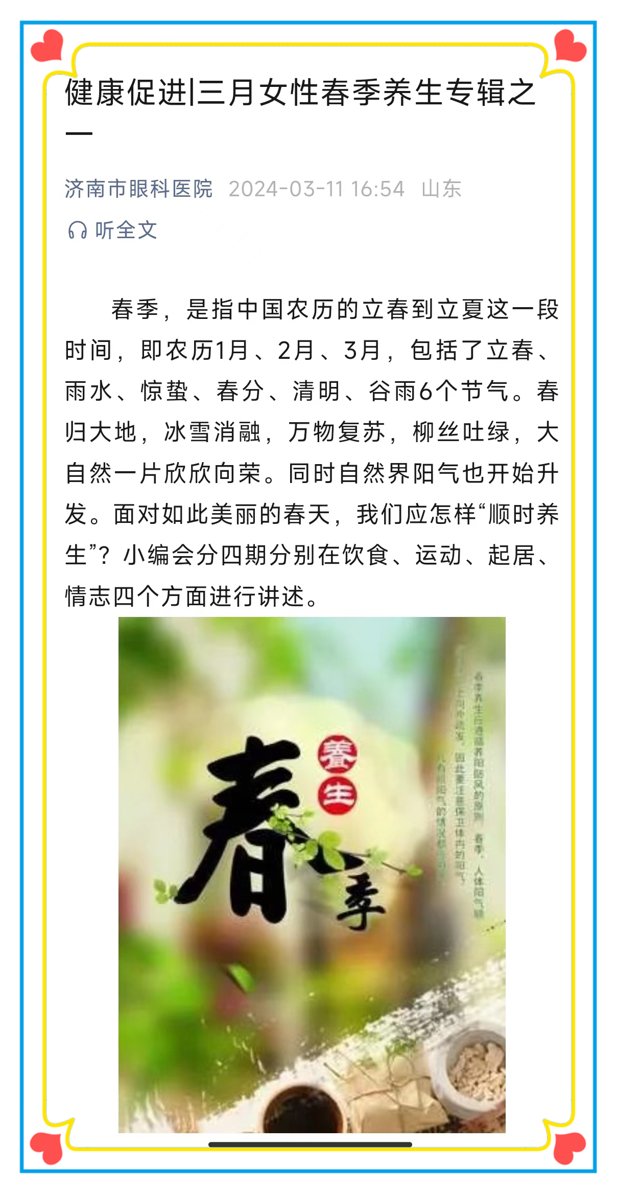 此外,为了普及健康养生知识,中医眼科巾帼文明岗在活动期间开展了“养生知识锦囊月”分享活动,利用医院官方微信公众号,每周推送一条健康养生小常识,内容涵盖了眼病防治、女性健康、饮食调养等多个方面,既实用又贴心。开展此次分享活动旨在向公众传播普及健康知识的同时,提高女性健康素养和健康文化水平。
