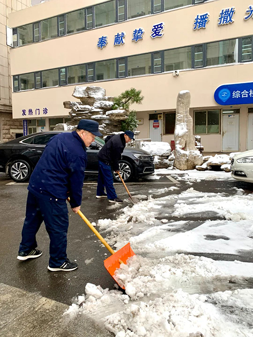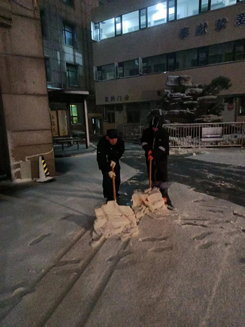 凌晨5点半,物业、安保等工作人员开始进行清理积雪、除冰防滑工作,确保医院内外道路畅通,并做到以“雪”为令,随下随清,防止患者及医务人员摔倒跌伤。