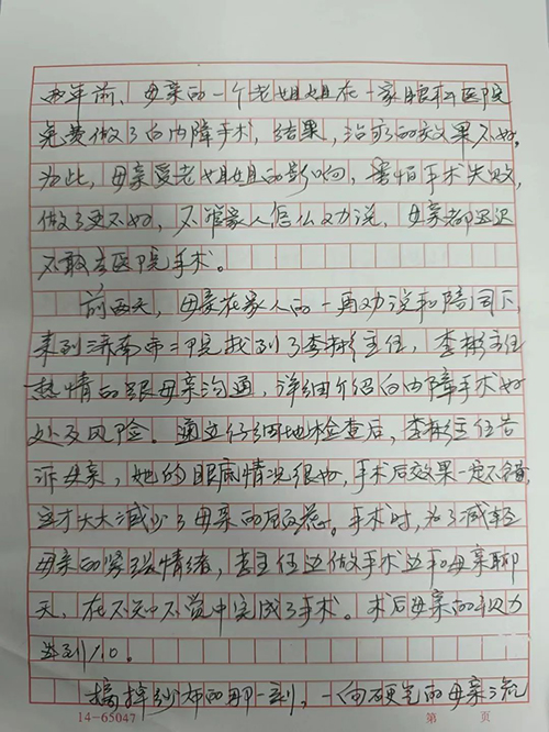 张大娘的女儿在信中写道:“五年前,母亲患上白内障,视力越来越不好,我们一直劝母亲去医院做手术,但由于母亲外地的一个老姊妹几年前因为眼睛问题在当地做手术没有成功,最后导致失明,给母亲留下了心理阴影。母亲是胆小的人,她也害怕是这样的结果,所以就特别的排斥做手术,生怕手术不成功却失去了现有的光明。母亲的视力几乎不能看清东西,曾经去过几家医院治疗,都因母亲的担心和顾虑没有得到有效治疗。后来,在家人的一再劝说下又才勉强同意来到美女视频