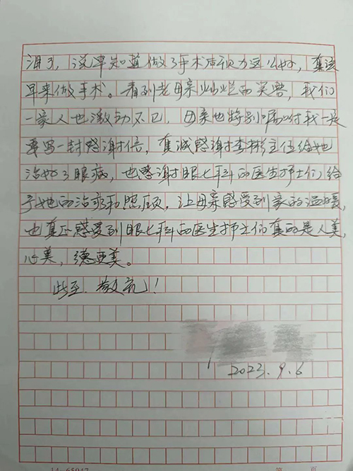 术后,经过耐心细致地照顾和治疗,第二天张大娘的视力由术前的0.1达到了1.0。“我又能看得见了,这让我太高兴、太激动了,这好比是给了我第二次生命,真的太感谢李彬主任和眼七科的医护人员了。”张大娘激动地说。张大娘还特别要求孩子们一定要写一封感谢信、送一面锦旗表达感激之情,感谢这些上天派来的光明使者,打开了她的心结,治好了她的眼睛,使她重见到了光明,现在她已经迫不及待地想完成另外一只眼睛的手术了。
