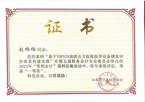 审计科刘楠楠申报的参赛案例《基于TOPSIS法的公立医院医学设备绩效评价体系构建实践》在评选中脱颖而出,获得山东省一等奖,并作为优秀案例在财务会计专业委员会学术会议上进行展示与交流。