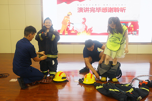 讲座结束后,由专业的消防官兵为大家展示作战服的穿戴方式,并邀请同学们上台试穿体验。学生们纷纷表示:“消防官兵需要穿着如此厚重的作战服进行救援工作实在是太辛苦了,今后一定会增强消防安全意识,提高火灾逃生的能力,尽可能的避免火灾火情的发生。”