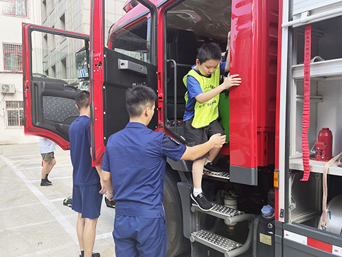 参观消防车是同学们特别感兴趣的环节,消防官兵们把消防车开进医院,为孩子们敞开式展示了车内的各项装备,并邀请学生们登上消防车,体验消防员的既视感。怀揣消防梦的学生们开心地与消防员们在车前合影,并表示一定好好学习、爱护眼睛、锻炼身体,长大后也要成为一名合格的消防员。