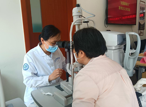 中医眼科医师邓大夫用裂隙灯为居民检查眼睛