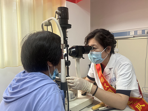 白内障科主任王晶用裂隙灯为患者检查眼睛