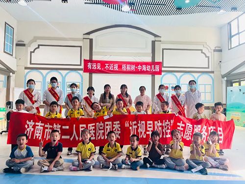 团委创建、济南市儿童青少年近视防控中心全员参与组成,注册志愿人数36人,其中青年志愿者所占总人数的 83.3%。“近视早防控”青年志愿服务队拥有专业筛查队伍6支,均为专业眼科医生、验光师,配备全自动电子视力表40余台,尼德克验光仪20余台。该志愿服务队通过发挥眼科医务工作者专业优势,针对近视低龄化问题开展早发现、早预防、早控制工作,以幼儿园、中小学为基地,广泛开展眼健康宣教、视力筛查、学生视觉健康建档等工作,初步建立起医院、校园、家庭三方联动的近视防控格局。