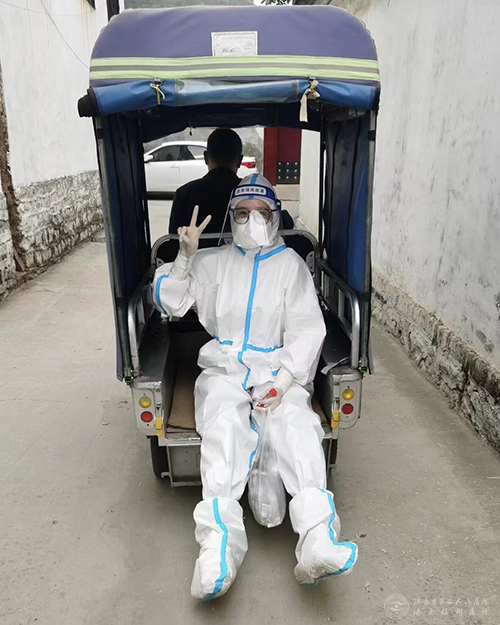 在市二院停车场,每天早晨5点半,运送核酸采样医务人员的大巴准时出发前往槐荫区玉清湖街道办事处。7点整,紧张有序的采样工作准时开始。春末夏初的济南,温差很大,早晚能穿毛,中午可着单。队员们必须克服一天气温变化带来的不适,在密不透气的防护服包裹下,不能喝水不能上厕所,一干就是几个小时。到了晚饭时间,队员们头晕胸闷,一点食欲也没有,只能强打精神简单吃几口盒饭,稍作休息后又投入到紧张的工作之中。每人日平均需采样1000余人次,回到医院已经是晚上11点多,但他们顾不上疲劳,回顾当天遇到的问题,分享好的工作方法。大家心怀使命感与责任感,严谨细致地完成好每一次核酸采样任务,用真情温暖每一位群众。