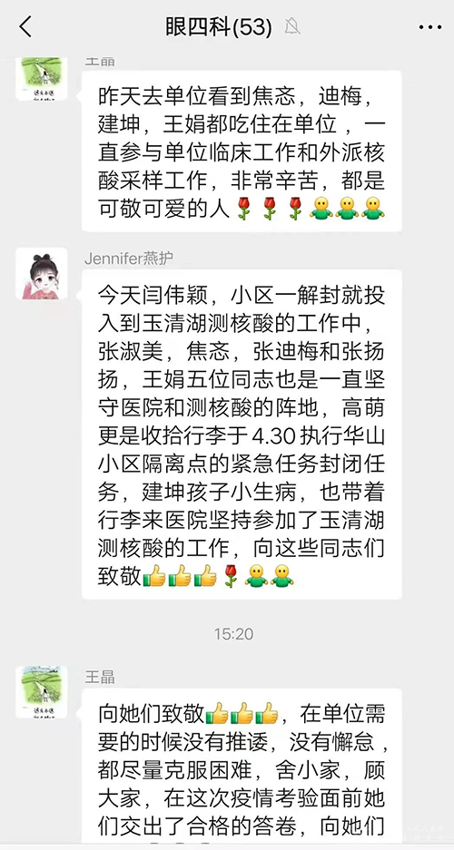 积极响应上级疫情防控号召,积极筹备医疗物资,迅速调配人员,全力投入抗疫工作。为打赢本轮疫情防控阻击战,全院上下有很多职工以院为家,奋战在医院与结对社区“两点一线”上,用敬业和真情做好每一次问诊治疗,用严谨和细致做好每一次核酸采样。他们不计个人得失、甘于奉献的高尚品格和集体主义精神感动着大家,眼四科就是其中的优秀代表。