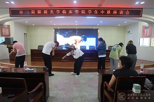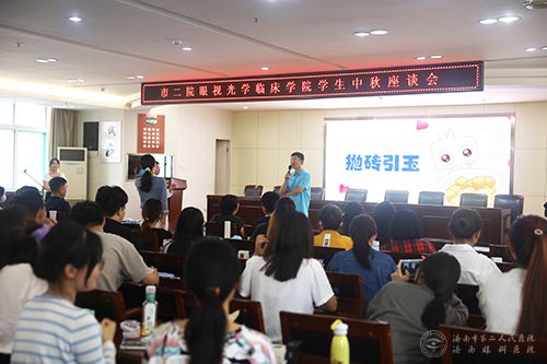 团委联合教育教学科举办了山东第一医科大学眼视光学临床学院学生中秋座谈联谊活动。市二院纪委书记李洁月,团委、教育教学科,学院教师代表,2018级、2019级全体学生参加活动。