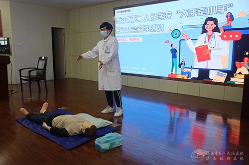 市二院眼一科护士长杨娜娜和内科医生王立新合作为大家讲解常用急救基础知识,并现场展示如何正确有效的实施心肺复苏(CPR),两名学生代表在医生的指导下完成了标准的心肺复苏急救动作。
