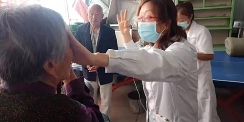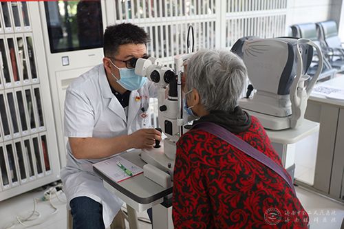 张晨明主任用裂隙灯为老人检查眼睛