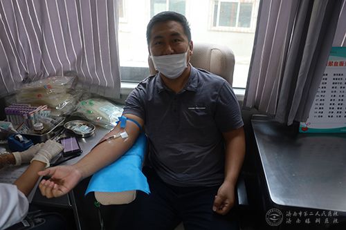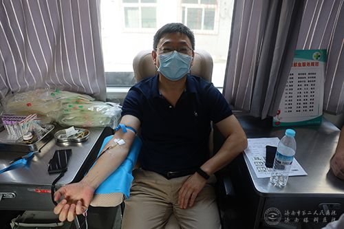市二院外派干部姚辉听说医院组织献血后,中午从济阳新市镇开车赶回医院参加献血,同事们开玩笑说他是“千里送热血”。
