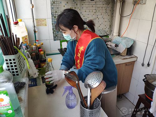 志愿者们为两位老人送去了新鲜的蔬菜,来自内科的青年医生刘梅为两位老人进行了血压、血糖和心电图的检查,并就血压控制、药物使用、常见病的预防给出了建议。随后,青年志愿者们进行了卫生打扫,并对全屋门把手和地板进行了消毒。