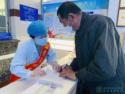 为充分发挥党支部的战斗堡垒作用和党员的先锋模范带头作用,进一步做好疫情防控工作,自2020年3月起,济南市二院行政党支部开展了以“战疫不松懈·党旗在身边”为主题的“党员示范岗”志愿服务活动。此次志愿服务活动主要是由行政党支部的党员志愿者开展门诊秩序维护值守工作,指导患者正确排队、乘坐电梯及等候;协助患者挂号、候诊、检查及办理出入院手续;指导患者保持一定距离,维持就诊秩序,合理安排检查项目;向患者及家属宣传疫情期间防护知识及疾病相关知识等一系列志愿服务。
