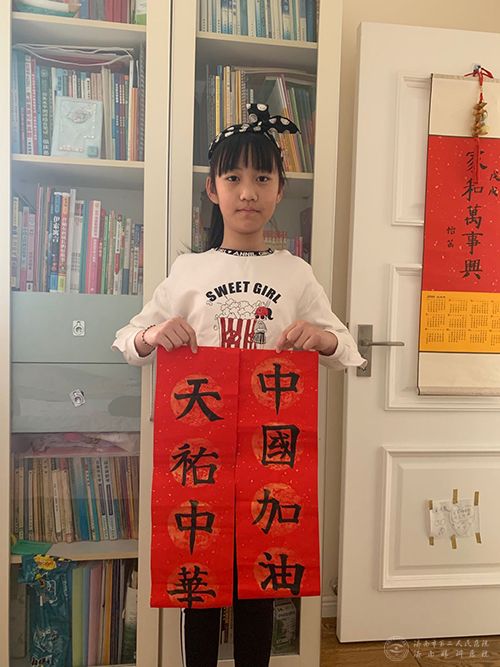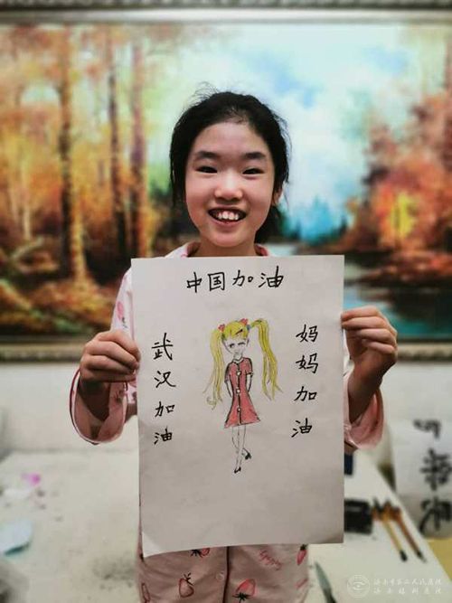 山东省第四批援鄂医疗队员李林峻的女儿欧阳婺奇,创作了漫画《美少女战士》,献给在方舱医院日夜忙碌的妈妈,为亲爱的妈妈加油,为武汉和中国加油!在孩子的眼中,妈妈如同美少女战士一样美丽又勇敢,她坚信有妈妈和所有白衣天使的齐心努力和守护,战疫必胜!中国必胜!中医眼科王俊杰的女儿李佳韵用跳动的色彩,斑斓的画面和独特的语言创作了战“疫”系列漫画,作品趣味十足又充满正能量,生动地展现了抗疫一线医务人员的工作状态和精神风貌,传递了对他们的感恩与牵挂。中医眼科王海燕的女儿葛怡涵小朋友用毛笔写下“中国加油,天佑中华”八个字,表达了对强大祖国的坚定信心,寄托了对早日战胜疫情的美好祝愿。