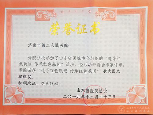 12月28日,山东省医院协会“追寻红色轨迹 传承红色基因”总结大会和协会医院报刊暨新媒体专业委员会2019年年会在济南举办。会议表彰了“追寻红色轨迹 传承红色基因”活动的相关奖项,济南市二院荣获优秀图文编辑奖,于娜荣获优秀编辑奖。