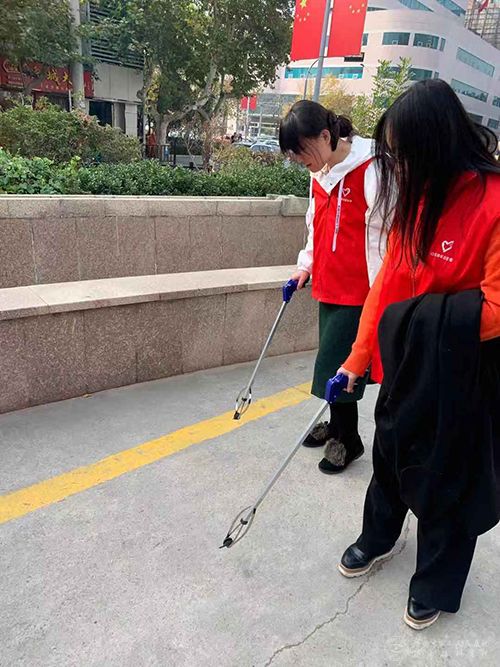 活动现场,志愿者们身穿红色马甲,深入社区街道,捡拾小区绿化带中的烟头和垃圾,维护社区内垃圾桶的卫生。