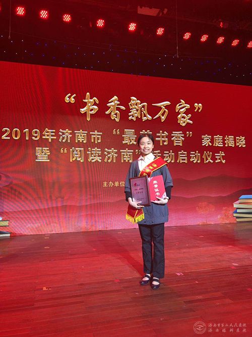 4月23日下午,由济南市妇联主办的“书香飘万家”2019年济南市“最美书香”家庭暨“阅读济南”活动启动仪式在济南市妇女儿童活动中心举办。市二院王婷家庭作为市卫健委妇委会推荐家庭,获得济南市“最美书香”家庭荣誉称号。