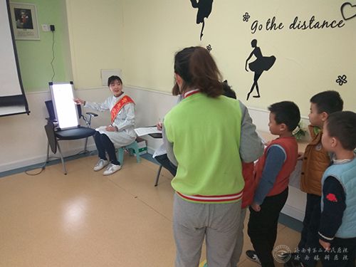 本次义诊团队由8名队员组成,他们分别承担公益爱眼小讲座、视力检查、验光检查等任务。来自市二院医学配镜中心的专业验光师主讲本次爱眼讲座,主讲人通过幻灯片和眼球模型与孩子们进行互动,她生动地讲解了眼睛保健常识,小朋友们举手抢答,课堂气氛十分热烈。在随后的视力筛查环节中,志愿者为85名适龄小朋友进行了视力筛查,为他们建立起了视觉健康档案,对疑似近视的小朋友进行验光复查,向保健老师进行了专门反馈。