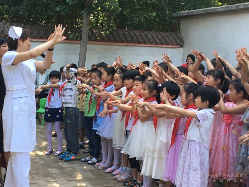 5月31日一早,志愿者们就乘车赶到了学校,一下车就受到李家岸小学全体师生的热烈欢迎。学校还特地让一年级的学生为大家准备了舞蹈。孩子们稚嫩的舞蹈顿时驱赶了大家的舟车疲劳。义诊成员立即融入孩子们的节日气氛里,和孩子们一起唱歌跳舞,并为他们送上节日的祝福和礼物。接下来来自小儿眼科的眼科副主任医师杨珺为小朋友进行了眼健康知识讲座。“我们人类从外界获得的信息,超过80%是靠眼睛获得,如果眼睛看不见了,刚才跳舞的小朋友还能跳吗?我们还能书吗?”“不能!”讲座在一问一答的互动中开始了。杨主任从眼睛的结构讲到造成近视的原因、如何避免眼睛受伤、斜视弱视和散光的防治方法,以及小朋友如何保持正确的握笔姿势和坐姿,小朋友听得十分认真,回答问题也很积极。随后手术室的李林俊护士又教小朋友如何洗手,小朋友随着李护士的“内、外、夹、弓、大、立、腕”的七字口诀,认真地比划。