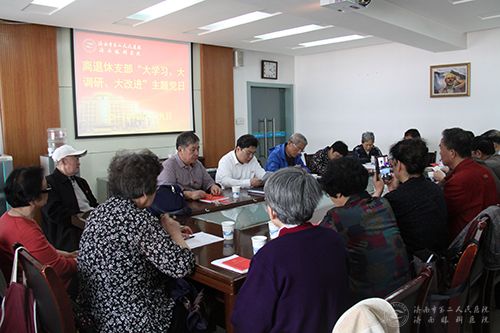4月19日下午,美女视频 离退休支部按照院党委的要求,组织开展了“大学习、大调研、大改进”主题党日活动。院党委书记牟鑫、离退休支部党员30余人参加了主题党日。