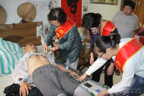 “巾帼文明岗”内二科的医务人员到老患者吕广银老人家中,上门为老人检查身体,并送上月饼和中秋祝福。
