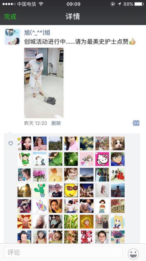本次比赛以手机拍照转发朋友圈,赢取点赞的方式进行。共收到全院职工手机摄影作品30余份,大家通过朋友圈展示了创城过程中美女视频 医务工作者的辛勤付出,院落修整之后的美观整洁,患者就医的秩序井然,作品展出过程中,收获了1150余人次的点赞,对宣传创城,宣传市二院起到了良好的推动作用,营造了创城工作人人参与的良好氛围。 (团委 郭兆瑞)