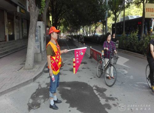 (济南眼科医院)文明交通志愿者冒着酷暑到经七纬六路路口值守,开展“我爱泉城 文明出行”交通志愿服务活动。