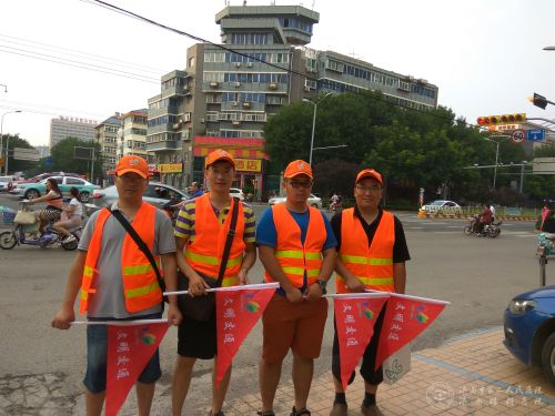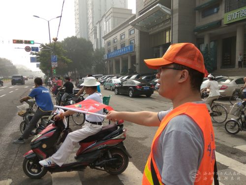 (济南眼科医院)文明交通志愿者冒着酷暑到经七纬六路路口上岗,开展“我爱泉城 文明出行”交通志愿服务活动。