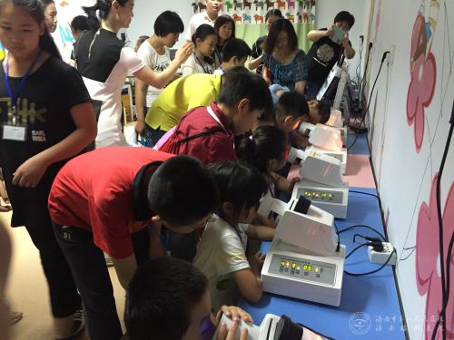 随后,家长和孩子们在医务人员的带领下先后参观了医院近视眼病防治门诊、弱视训练室、医学验光配镜中心等处,进行了多项视觉功能检查、5D视觉影视视频体验、医学验光等,并实地观看了医学配镜及眼镜制作的流程。活动中,医院眼科医务人员一边演示一边讲解,孩子们认真聆听,积极参与,家长们也趁此机会向眼科专家咨询。