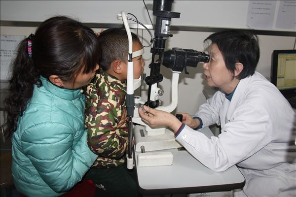 眼科专家为孩子检查眼睛