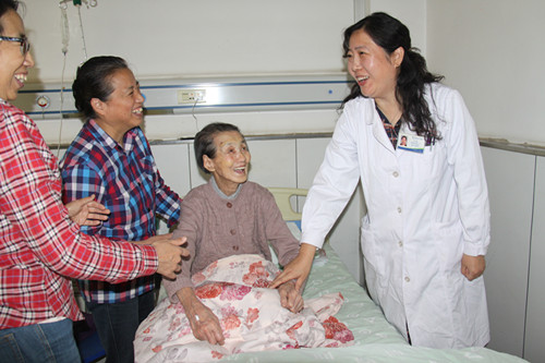 这位老人姓李,几年前突然感觉视物模糊,视力下降,但因为身体不便,老人并没有到医院接受进一步的治疗。近一年来,李奶奶病情突然加重,眼睛几乎看不清任何东西,生活无法自理,这让一家人都慌了神。于是,在子女的陪伴下,李奶奶来到市二院就诊,眼四科主任王晶为老人做了详细的检查,经过检查,王主任认为老人的基本状况良好,具备实施手术的条件,并为老人制定了详细的手术方案。手术当日,李奶奶的儿女、孙子孙女们一家7口全部聚齐手术室外,不到半个小时,李奶奶就在护士的搀扶下走出了手术室。“做完了?这么快,怎么样?”家人一边扶着老人,一边问。“手术已经做完了,很顺利!”伴着护士的回答,一家人的心终于落了地。第二天,王晶主任到病房为老人复查,纱布一揭开,李奶奶就非常激动地说,“看到了!看到了!很清楚,我终于可以再到家里楼下公园里转转了!”看到老人一家开心的模样,医护人员们也都会心地笑了。