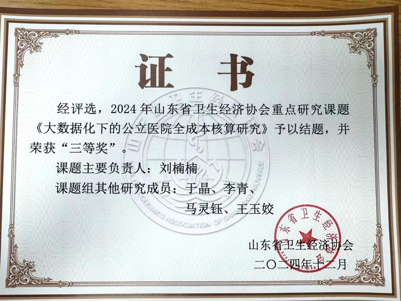 )财务科研究的课题《大数据化的公立医院全成本核算研究》获评三等奖。