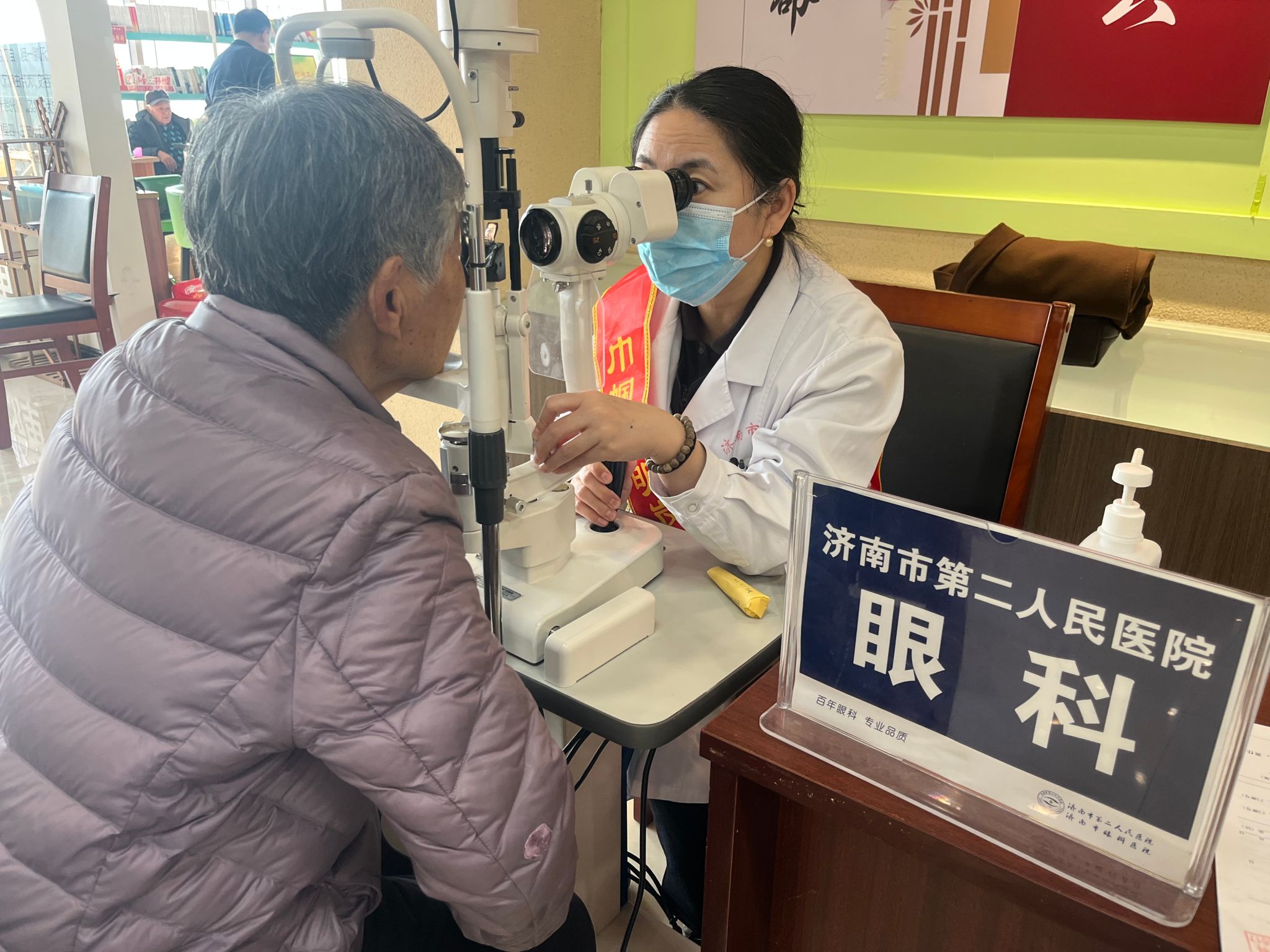 志愿者用裂隙灯为村民检查眼睛