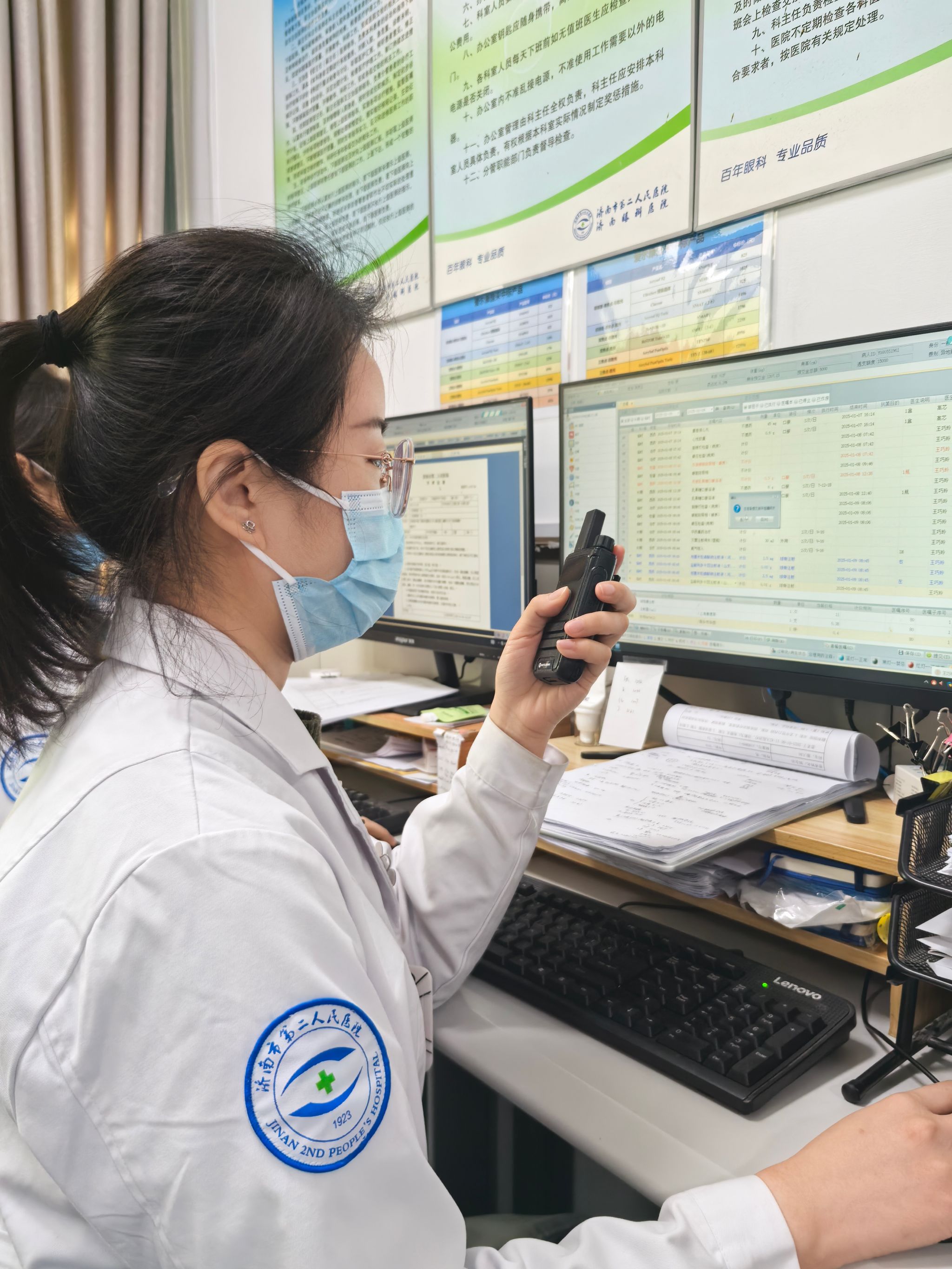 眼六科(眼表疾病专业)病区手术患者多、陪护人员流动频繁,以往,医生下达紧急医嘱、患者呼叫需求时,医护人员不得不频繁奔走或高声交流,不仅消耗体力,更让病区环境嘈杂,影响患者休息。如今,走进眼六科病区,映入眼帘的不仅是整洁明亮的病房环境,还有护士们身上佩戴的黑色“小盒子”——无线对讲机。这个小巧的设备已经成为了医护沟通的得力助手,仅需轻轻按住对讲机按键,指令便能精准传达,责任护士在病房忙碌时,可通过对讲机快速协调其他同事支援;主班护士处理医嘱时,也能第一时间与病房护士核对信息,避免重复工作,全程无需高声交流,患者可以在安静的环境中静心休养。此外,对讲机还缩短了患者等待时间。例如,术后患者返回病房后,责任护士通过设备实时通知责任医生查看患者情况,确保术后医疗护理无缝衔接。