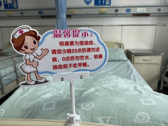 眼四科白内障病房里老年人居多,患者年龄偏大,记忆里差,对于护士交待的注意事项很容易忘记,眼四科的护士们会一遍又一遍的叮嘱,“李大爷,明天抽血,记得晚上十二点之后就不要喝水不要吃饭啦,一定记住哟!”如今,眼四科护士们制作了抽血提示牌,放在病人床尾,时刻提醒病人注意第二天抽血及禁食禁饮的时间,确保病人治疗流程的顺利进行。