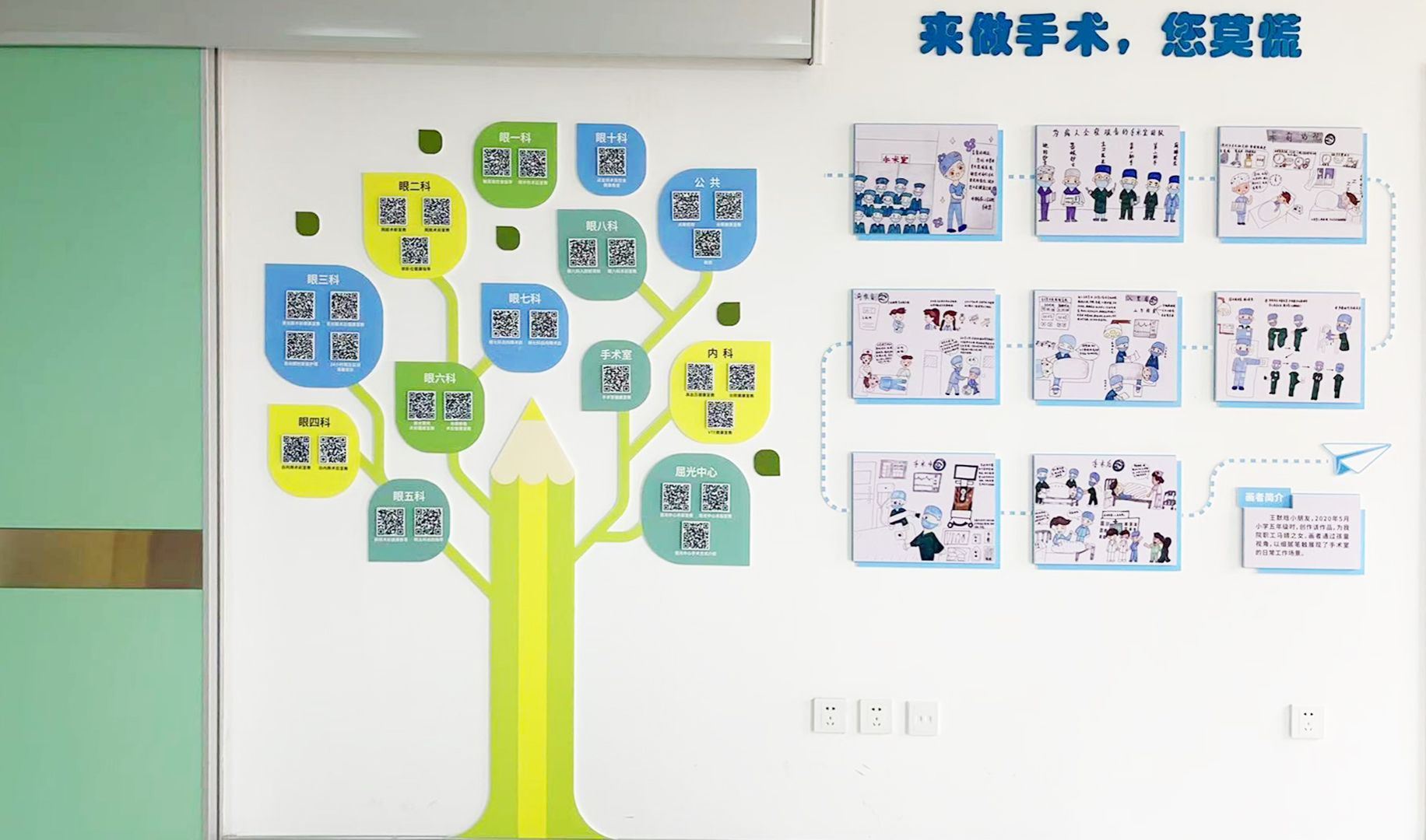 右侧区域一棵生机盎然的“健康宣教树”格外引人注目,这棵高大的仿真树以浅绿色树干为基,枝叶舒展如华盖,每一片翠绿或金黄的“树叶”都承载着独特使命——叶片表面印制着各科室专属的健康宣教二维码,指尖轻扫即可解锁医学奥秘;而手术室充满创意的漫画版健康宣教更是别具匠心,以诙谐幽默的视觉语言,将手术室相关知识娓娓道来,让患者与家属在驻足间收获温暖与知识。用灵动笔触勾勒出手术室专属的科普画卷,让严肃的医学知识变得鲜活易懂。