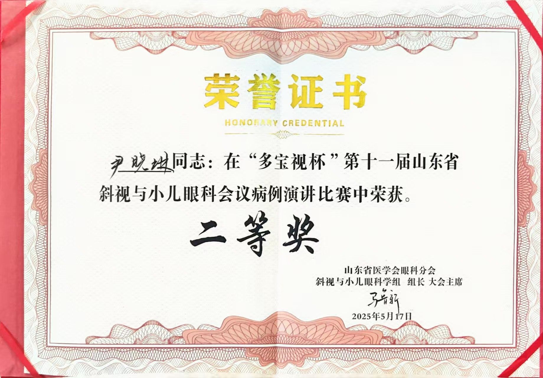 )眼五科(儿童眼病专业)副主任医师尹晓琳凭借扎实的专业知识和丰富的临床经验,在众多参赛选手中脱颖而出,荣获病例演讲比赛二等奖。
