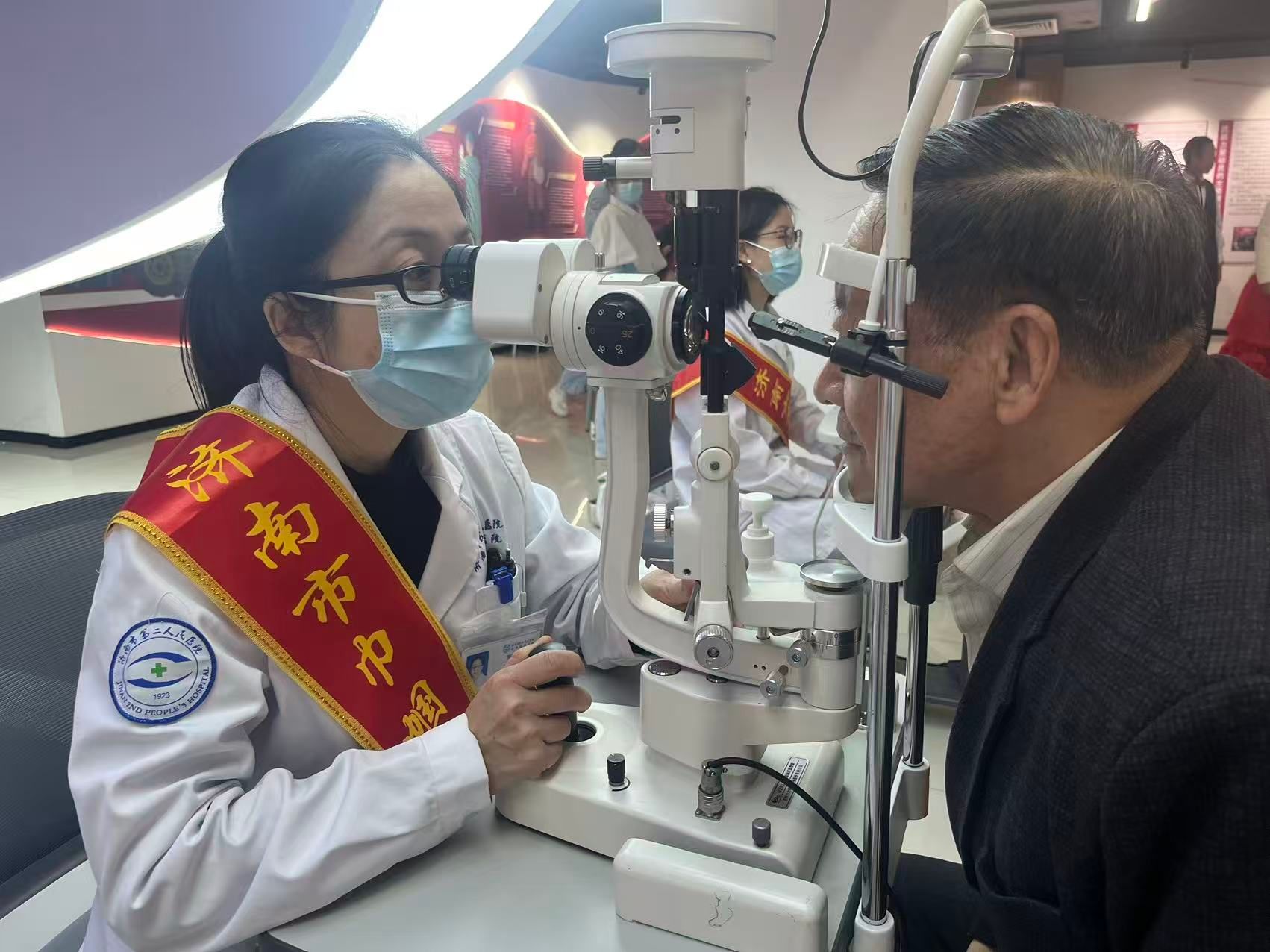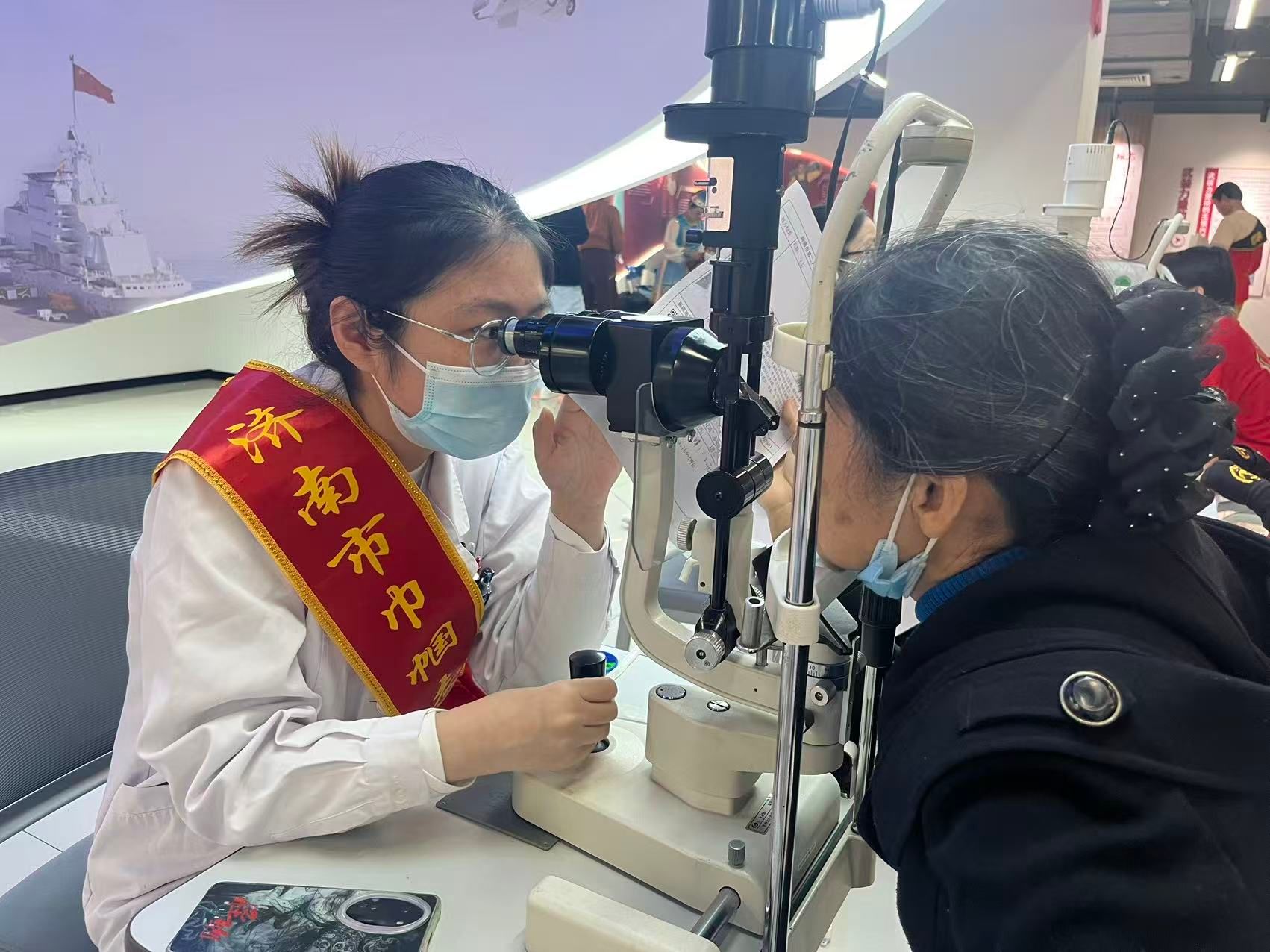 与此同时,眼七科(白内障二科)副主任医师栗映梅带领医护团队在现场开展了眼健康义诊活动。义诊项目丰富多样,包括视力检查、裂隙灯检查、眼底镜检查等,全面细致地为老年人进行眼部健康评估。专家耐心询问每位群众的症状和病史,认真解答他们的疑问,并根据检查结果给出专业的治疗建议和日常护眼指导。