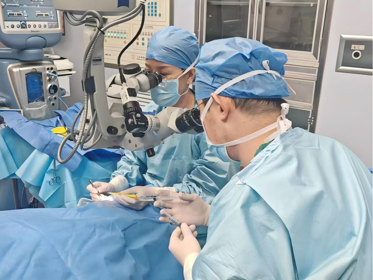 经过与麻醉科等多学科严谨讨论,团队为老人量身定制了周密手术方案:在全麻下,实施“左眼小梁切除术+瞳孔成型+白内障超声乳化抽吸术+人工晶状体植入术”。这一联合手术旨在一次手术中同时解决青光眼与白内障两大问题,最大程度减少创伤,对高龄体弱者至关重要。