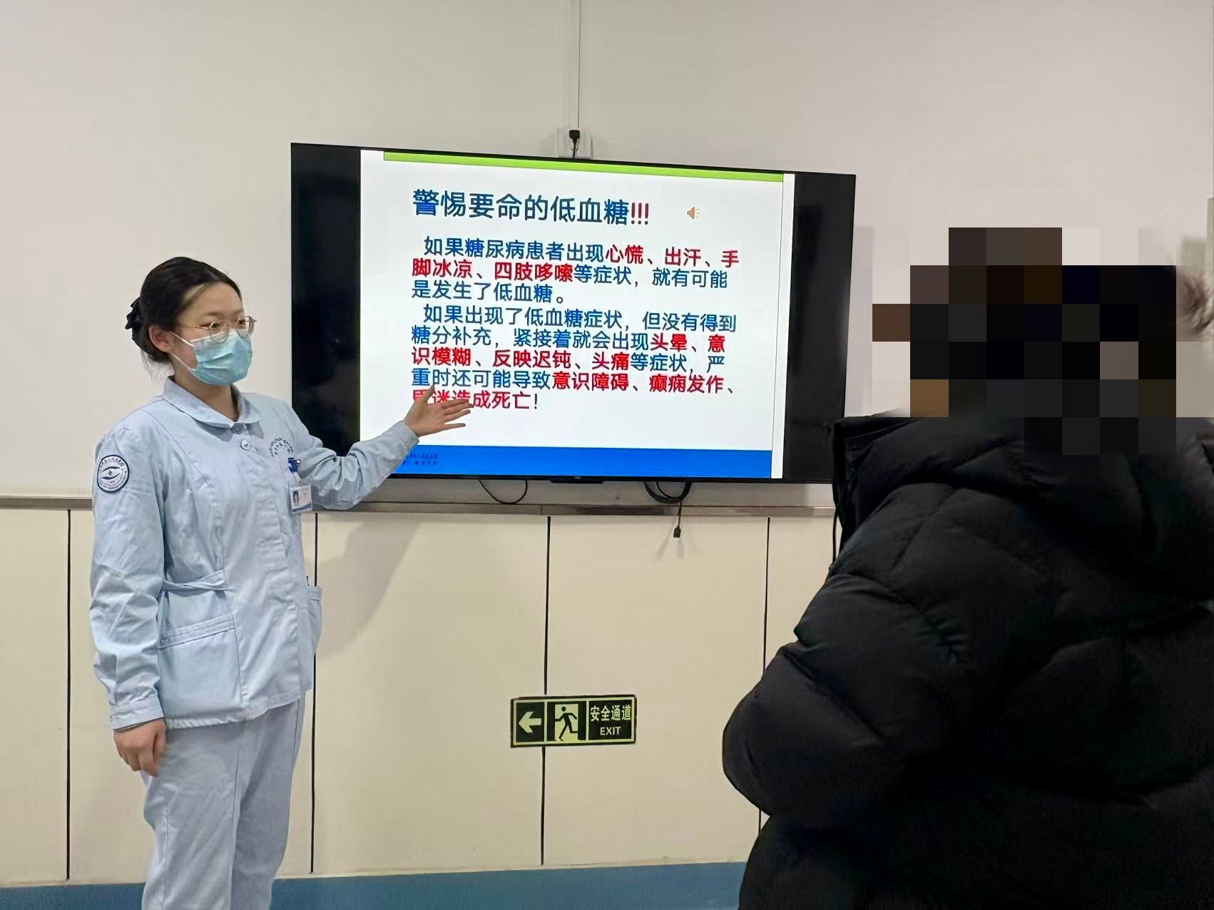 同时,李群护士长带领的眼二科护理团队针对糖尿病患者开展一系列健康宣教。责任护士借助病房电视,通过图文并茂的宣教视频,为孙女士讲解糖尿病防控知识。视频同步展示饮食搭配、运动要点、血糖监测规范,强调控糖、戒烟、规律用药的关键作用。生动画面搭配专业讲解,让抽象知识直观易懂,患者们认真观看,纷纷表示收获满满,增强了早筛查、早干预的意识。
