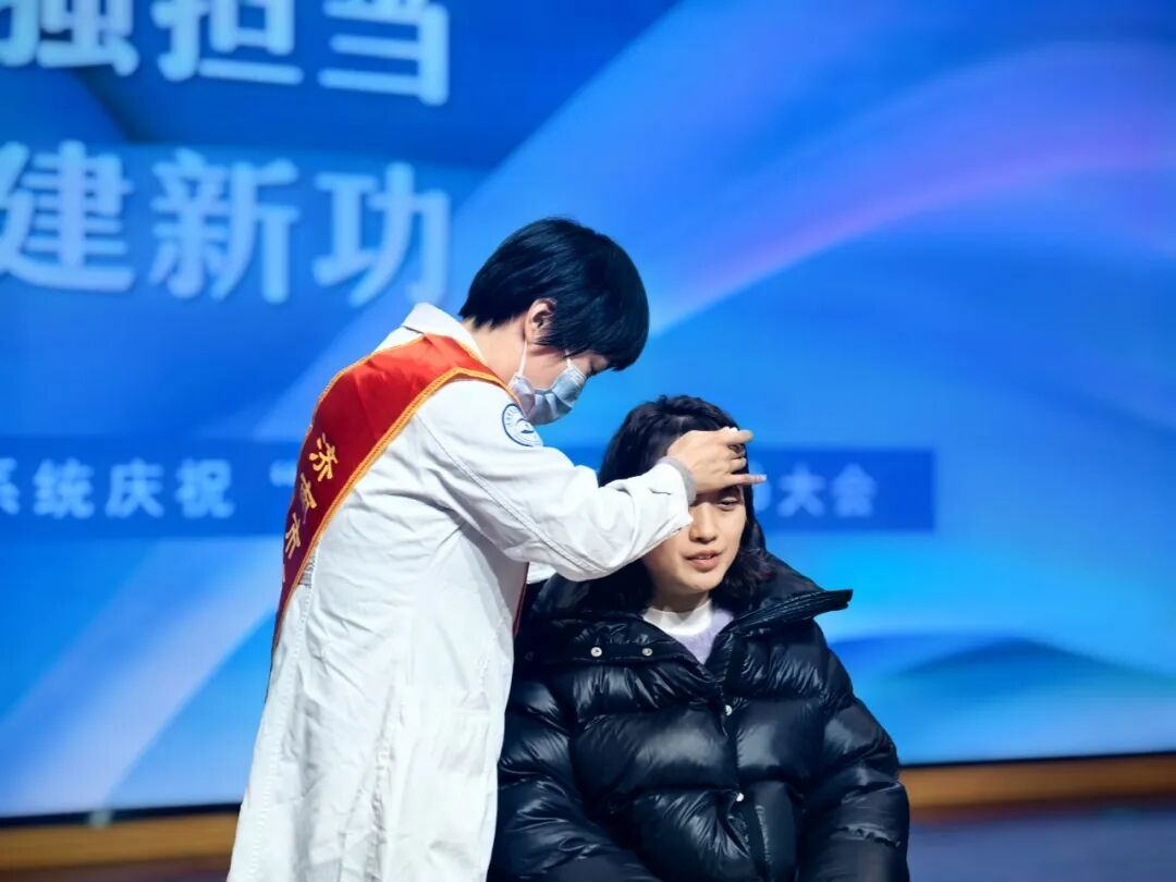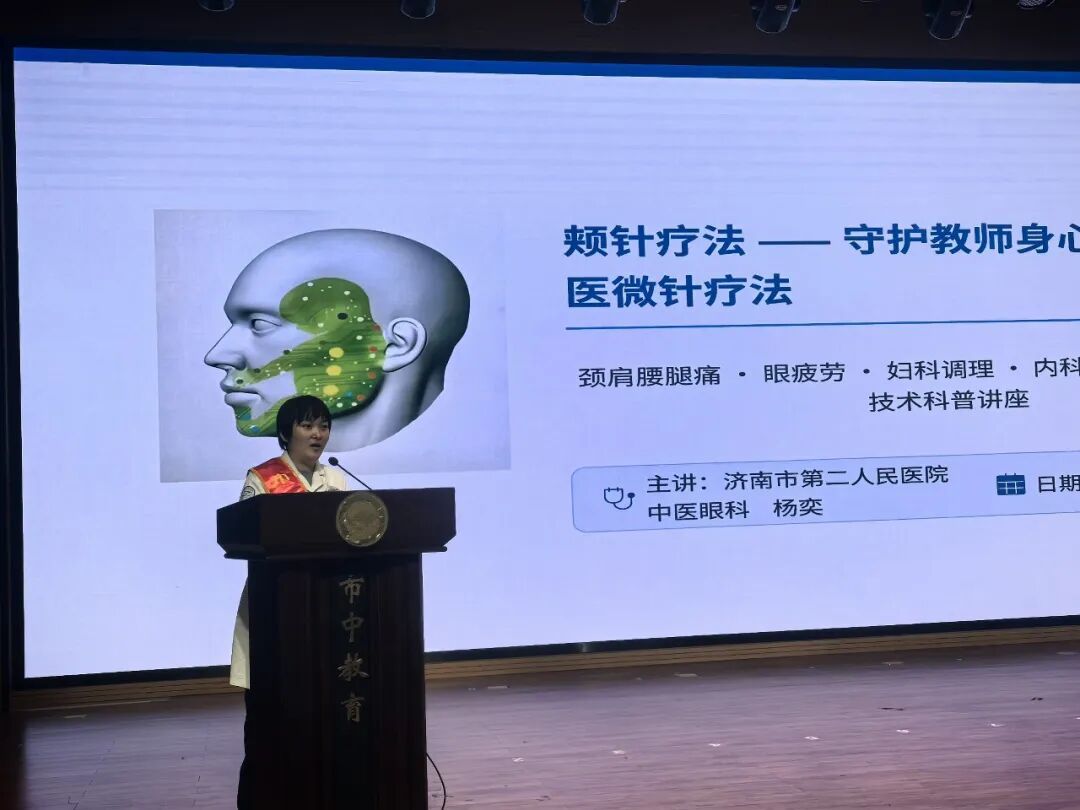 考虑到教师群体常见的颈肩腰腿痛等职业劳损,眼十科(中医眼科)主治医师杨奕带来了特色“颊针疗法”介绍。她概括了该疗法“安全、无痛、效捷”的特点,说明其通过调节面部穴位即可疏通经络、缓解全身疼痛及调理女性亚健康状态,为老师们提供了一种便捷的中医保健新思路。讲座结束后,活动特别设置了颊针疗法现场体验环节。