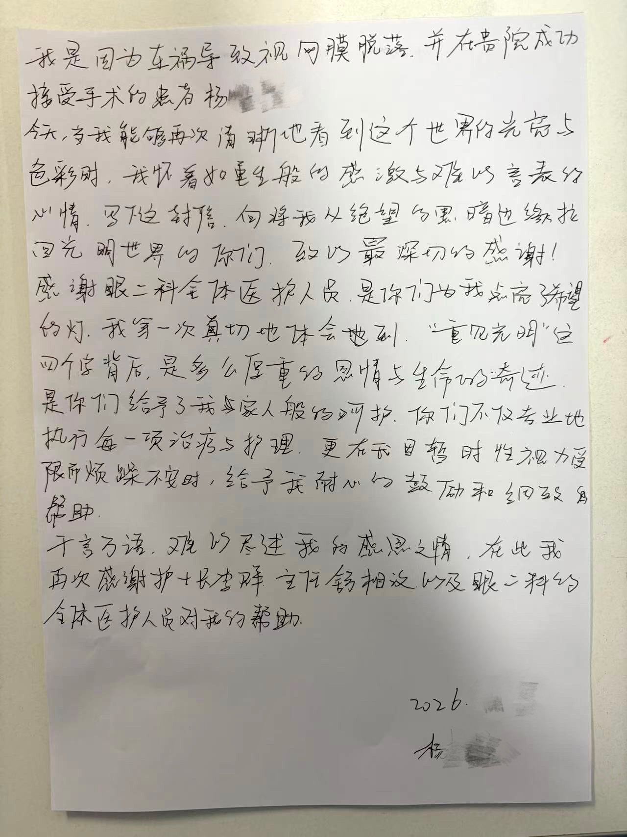 从绝望无助到重见光明,不仅是一台手术的成功,更是医者仁心与专业担当的生动诠释。市眼科医院(市二院)始终坚持以病人为中心,以精湛医术守护光明,以人文关怀温暖人心,用专业、责任与温情,为每一位眼疾病人点亮希望、守护清晰“视”界,让光明与温暖相伴前行。