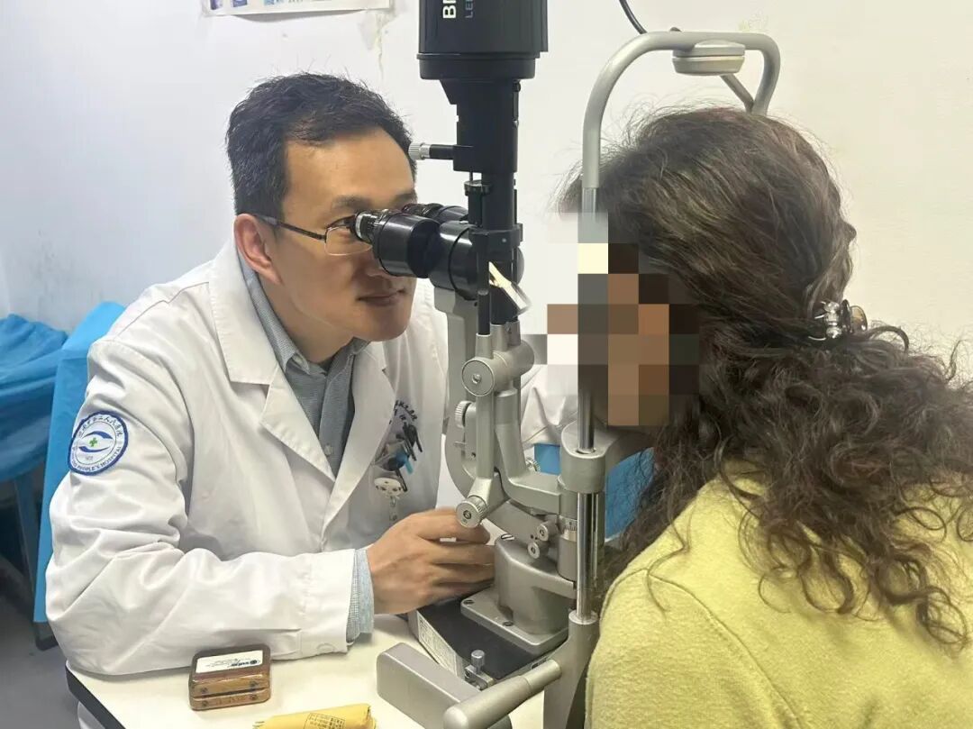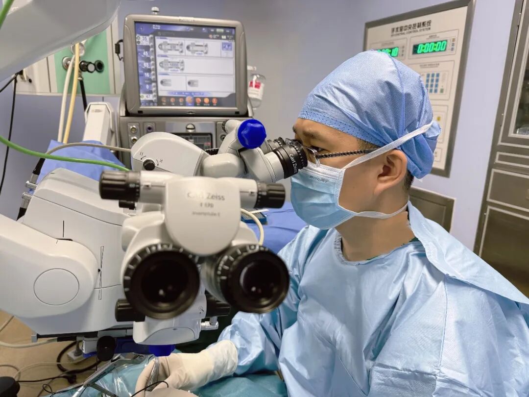 眼八科(眼内科)负责人、副主任医师黄超为杨女士进行了细致检查。诊断结果让人揪心:高度近视引发黄斑区圆形裂孔,裂孔周围的视网膜已出现青灰色隆起,需要尽快手术。黄超教授耐心地向杨女士解释病情:"传统手术虽然能让脱离的视网膜复位,但对于像您这样较大的裂孔,闭合率偏低、术后复发率较高,效果不够稳定。”
