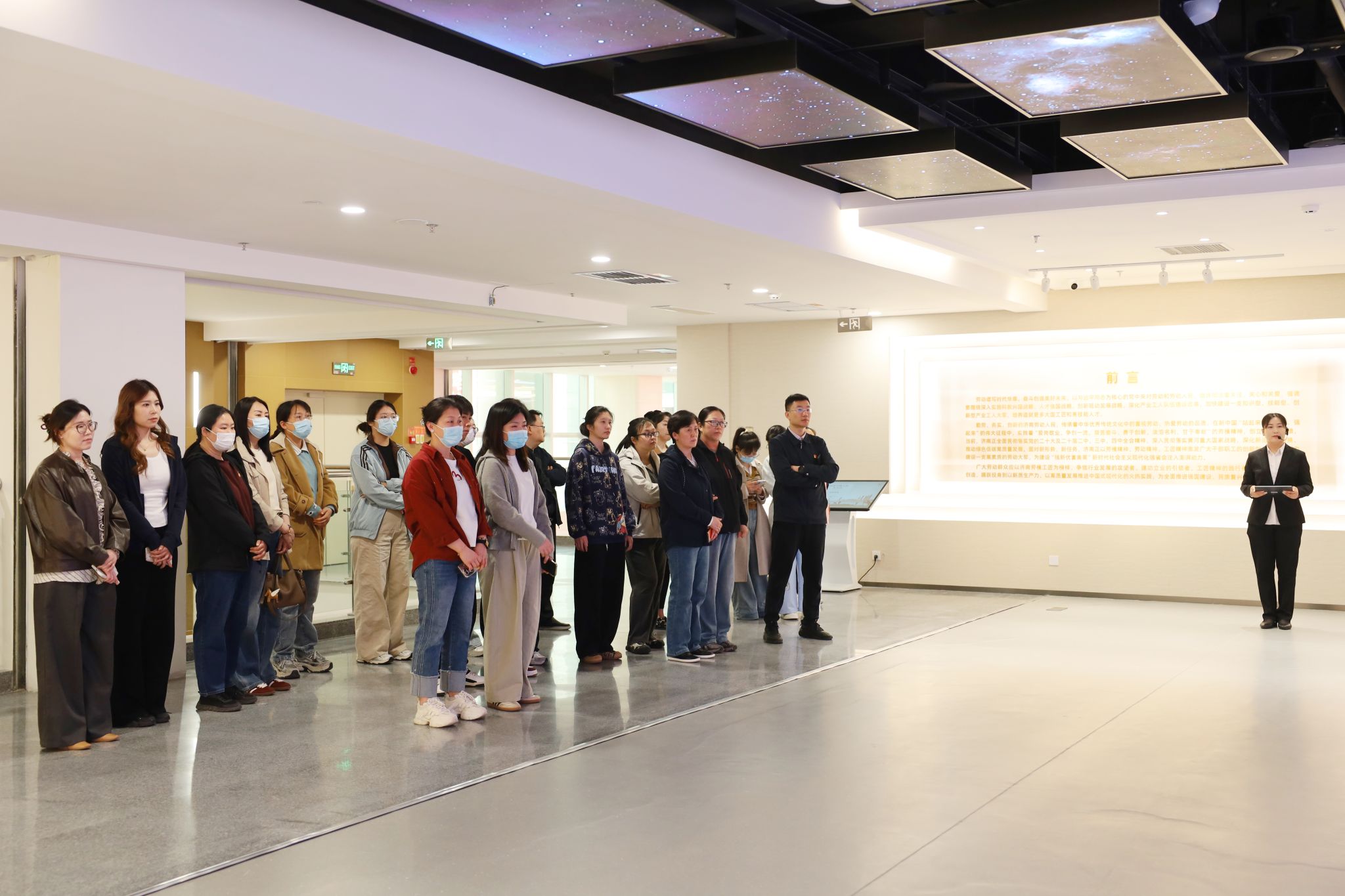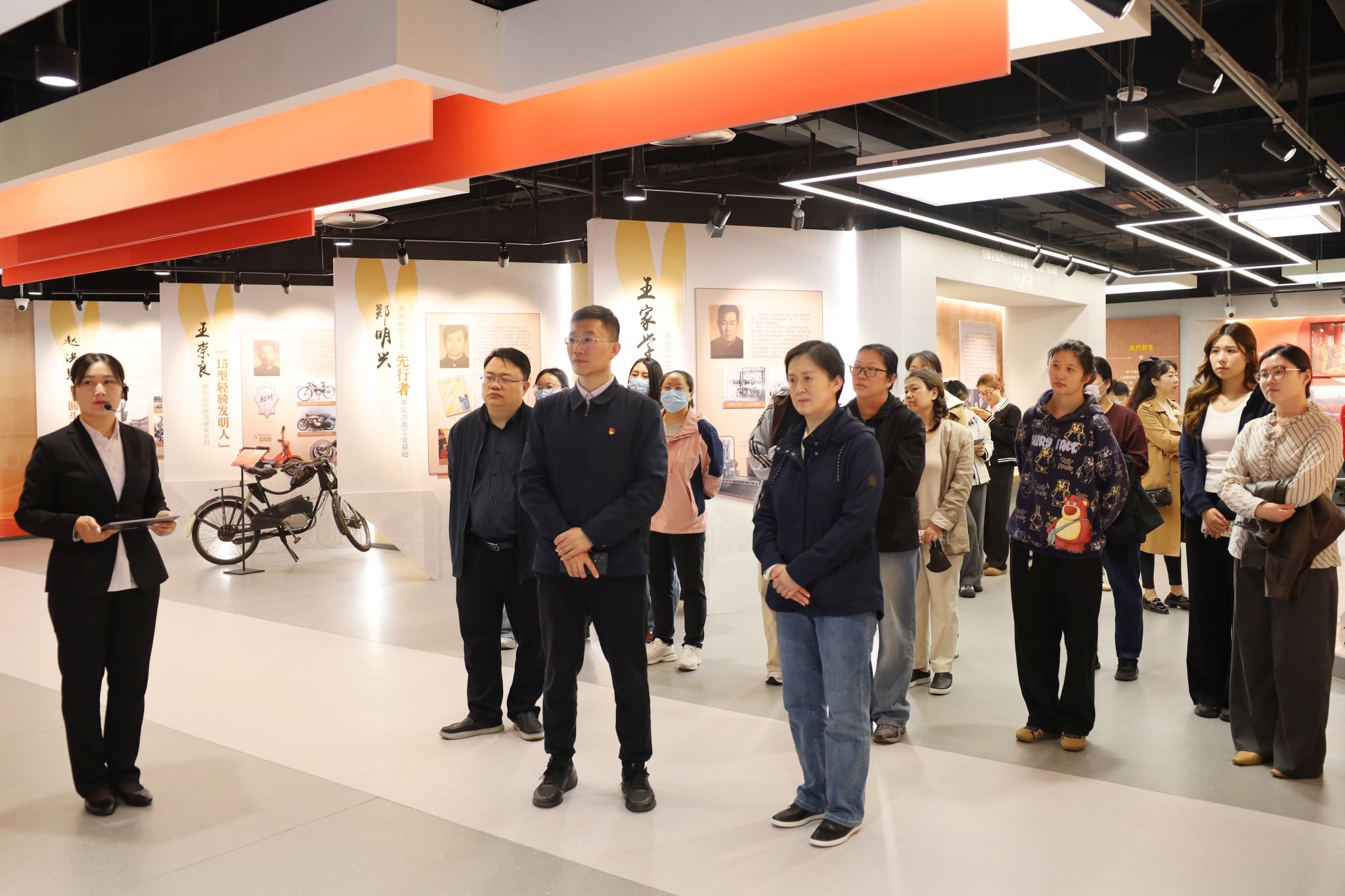在济南工人运动历史展览馆内,大家跟随讲解员的步伐,沿着“砸碎铁锁链”“建设新中国”“改革立潮头”“建功新时代”四大主题篇章,回顾济南工人阶级百年奋斗历程。展馆综合运用动态屏幕、全息影像、裸眼3D等科技手段,结合历史实物与艺术造景,生动再现了工人阶级在党的领导下争取民族独立、推动国家建设的壮丽史诗。一幅幅珍贵影像、一件件历史实物,让职工们深刻感受到“劳动创造历史”的磅礴力量。