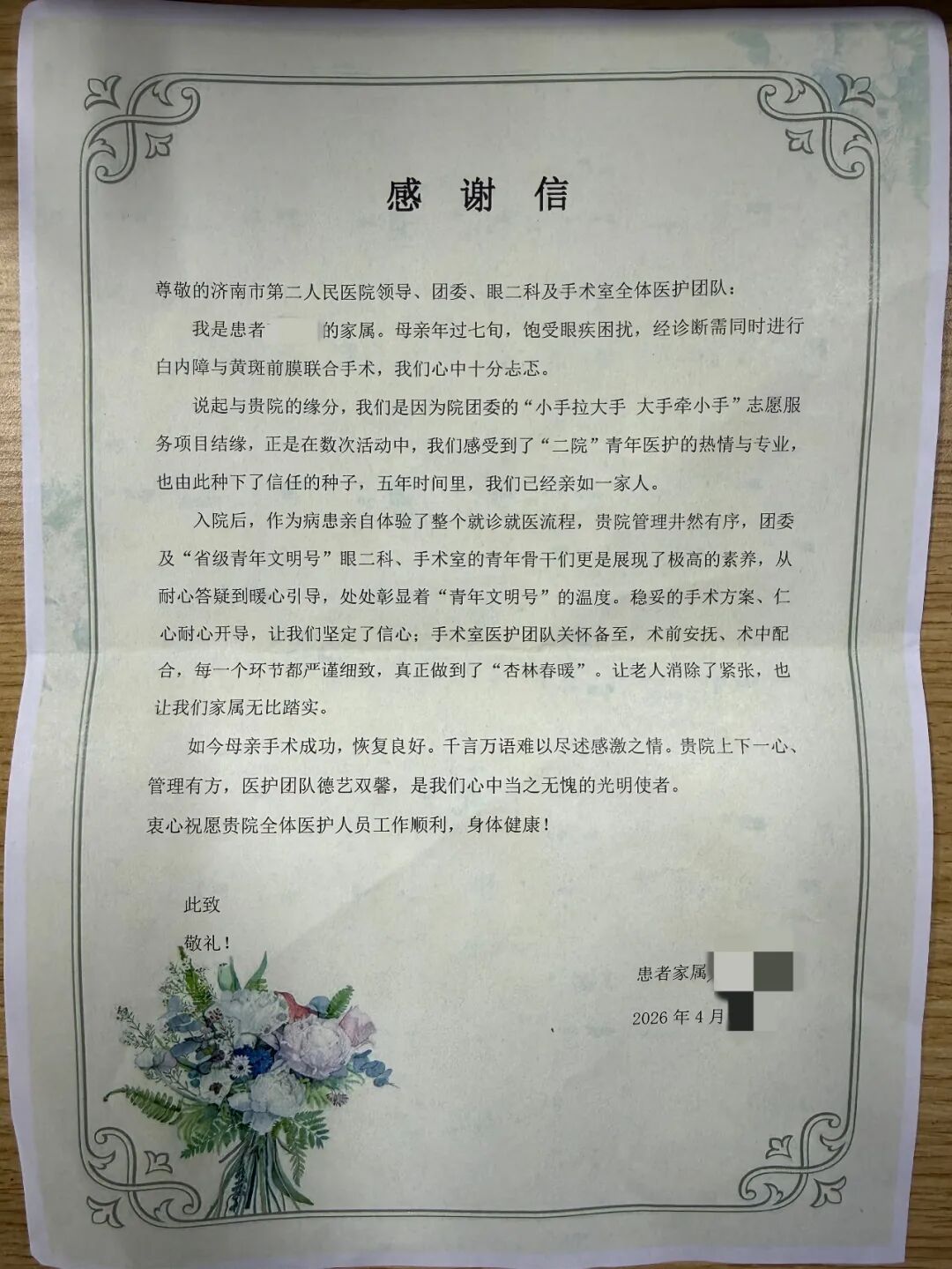 在为老服务一线,结对老人高阿姨常年受腿脚不便、黄斑变性、白内障困扰,视力严重下降,生活多有不便。了解情况后,医院省级青年文明号眼二科与手术室接力守护,为高阿姨开通绿色诊疗通道,从术前精准检查、个性化手术方案制定,到术中精细操作、术后全程康复护理,医护团队与青年志愿者贴心陪伴,手术效果远超预期,老人重获清晰“视”界。为表达感激之情,高阿姨专程送来锦旗和感谢信,字里行间满是认可:“医护人员专业又暖心,不仅治好了我的眼睛,更让我感受到家人般的温暖!”这是对医院眼科诊疗技术的高度肯定,更是对项目“健康+温情”双重守护模式的真挚赞誉。